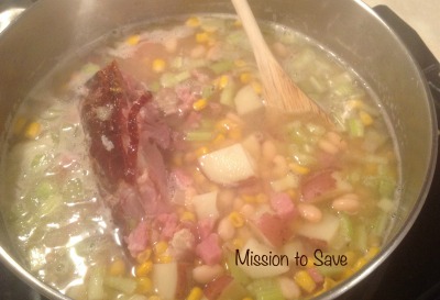 - In the picture below you can see I cook the ham bone in with the veggies at first. This just gives a deeper “ham” flavor and is completely optional. Just remove the bone right before adding in the roux mix.