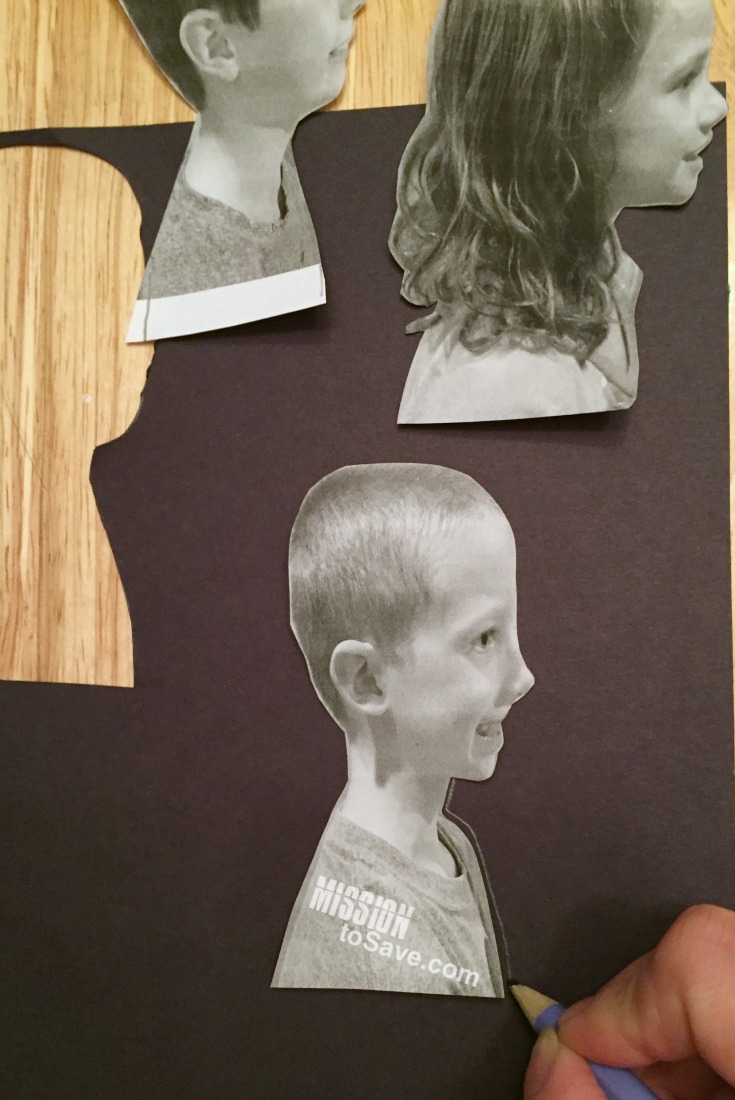 1. Take a profile picture of your kiddo. I chose to do it on a plain wall just so the image would be clear of distractions. I would take a couple to be sure you get the right “look”. Also, if you are taking pics of multiple kids do it at the same time and from same angle. Be sure to include the top of their shoulders too, this way the profile image doesn’t just look like a floating head.