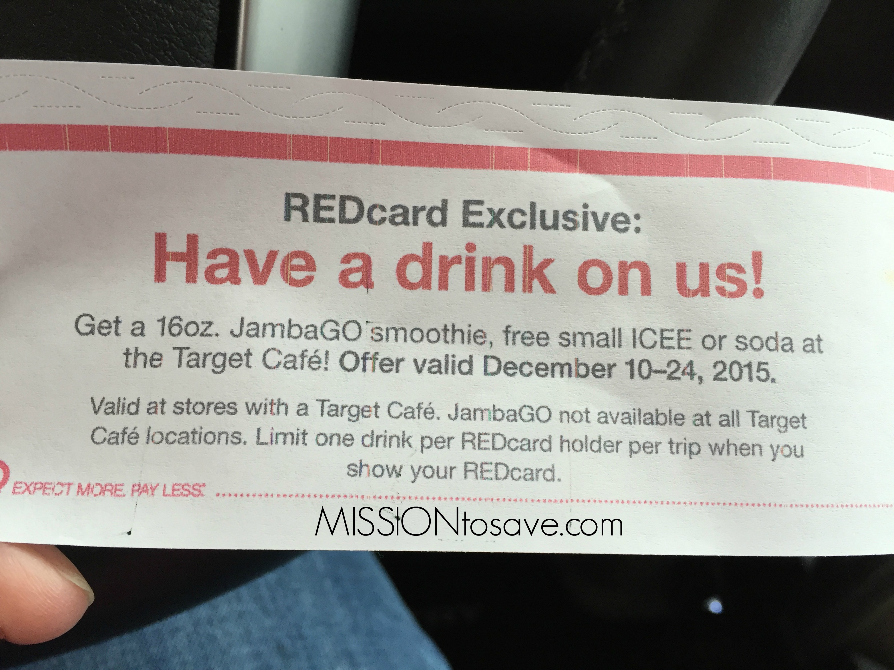 Calling all Target REDcard holders! Get a FREE JambaGO smoothie, free small ICEE, or small soda at the Target Cafe every day from December 10-24! This offer is valid at stores with a Target Cafe. You must show your REDcard in order to get this freebie.